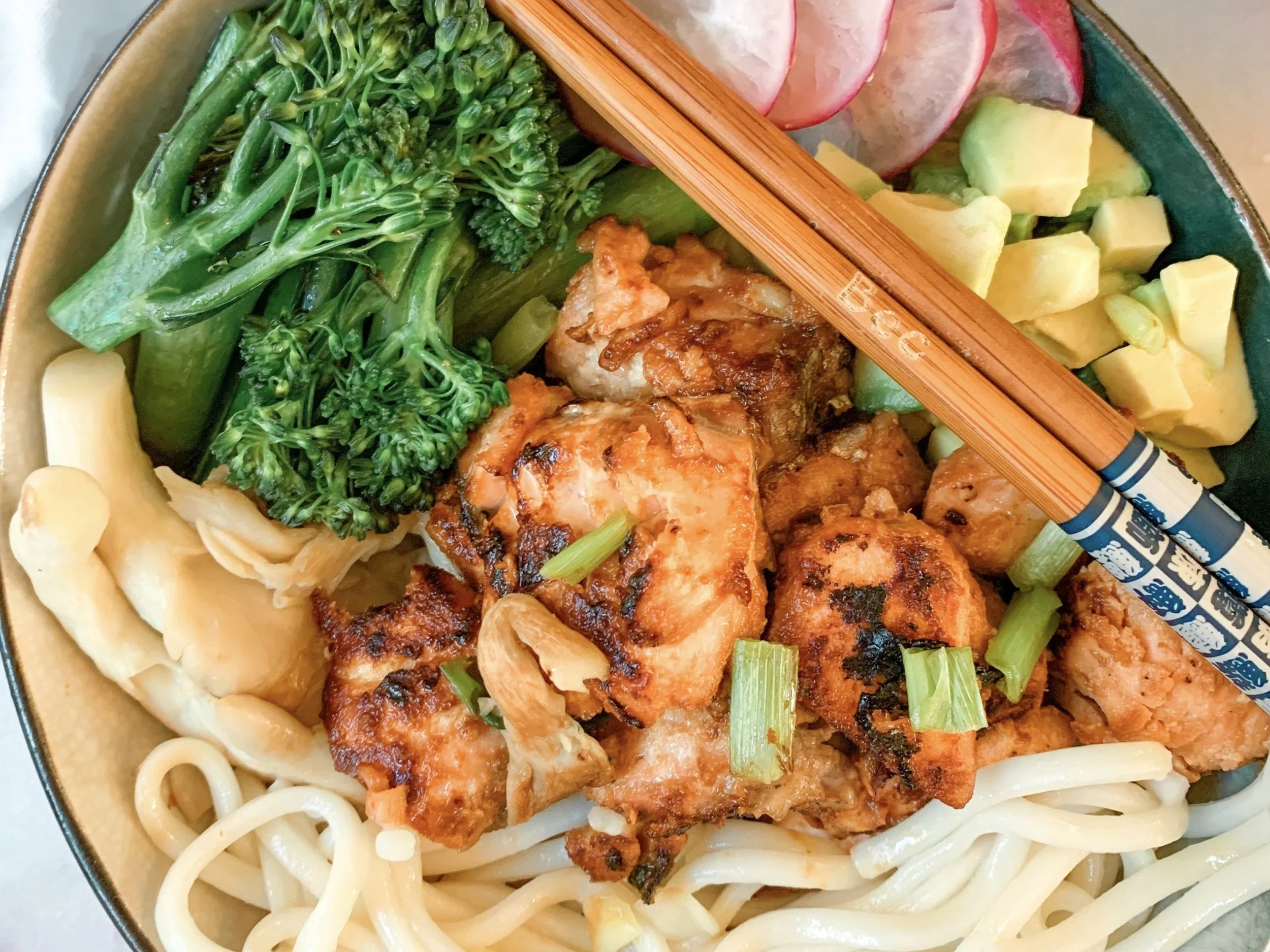 - Divide noodles between to bowls, add cooked salmon and top with veggies. Mix to combine.
